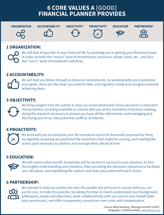 This infographic developed by financial planner Michael Kitces illustrates the six core values that a good planner provides.